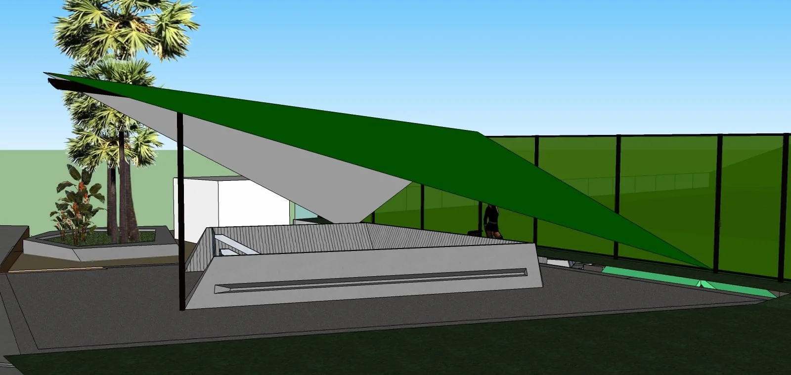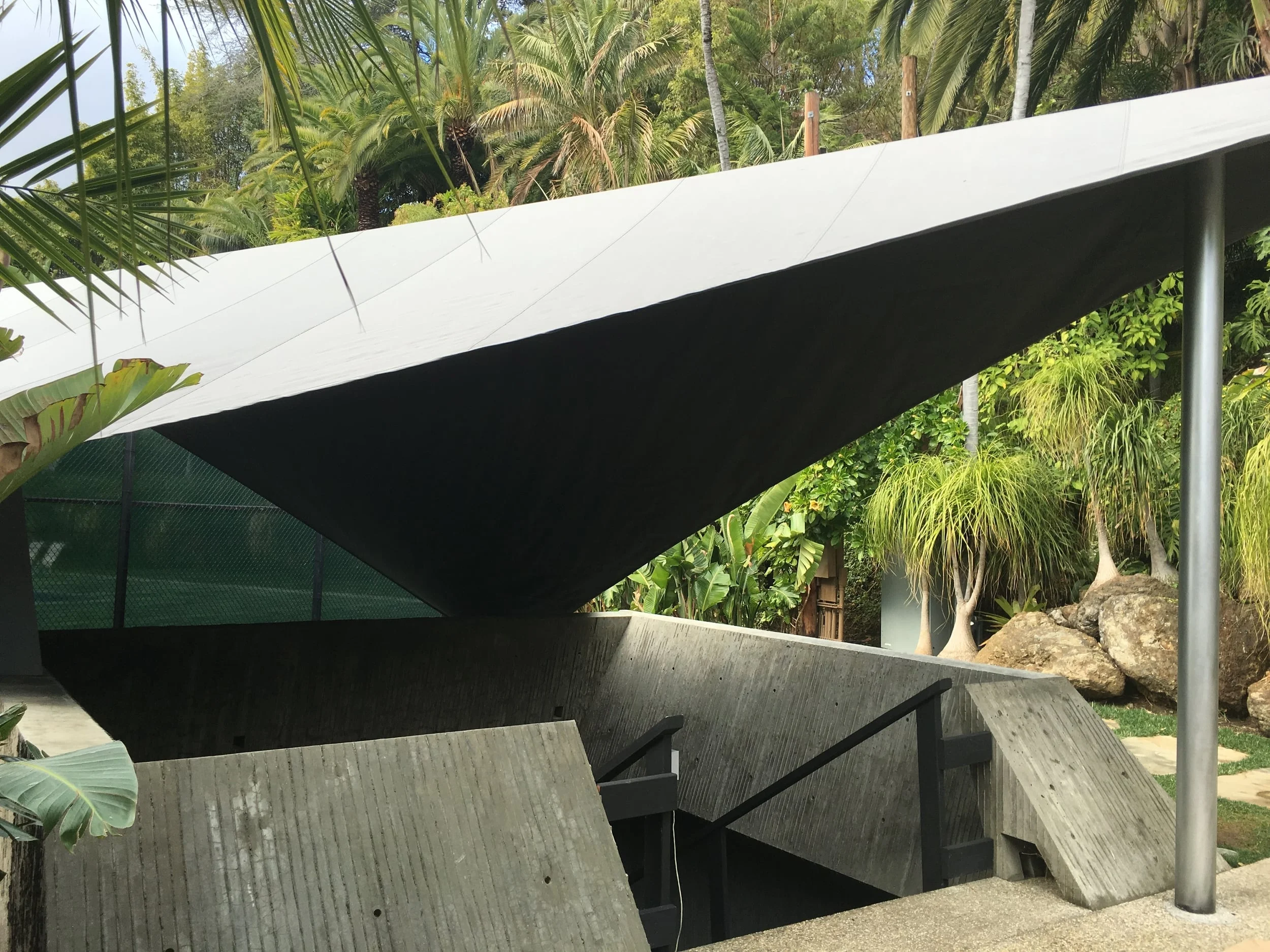 We are excited for our first erected tensile canopy structure! The steel support structure was quickly erected and painted by metal fabricators Breakform Design. The custom canopy was fabricated out of sunbrella fabric material by Sark Custom Awnings.