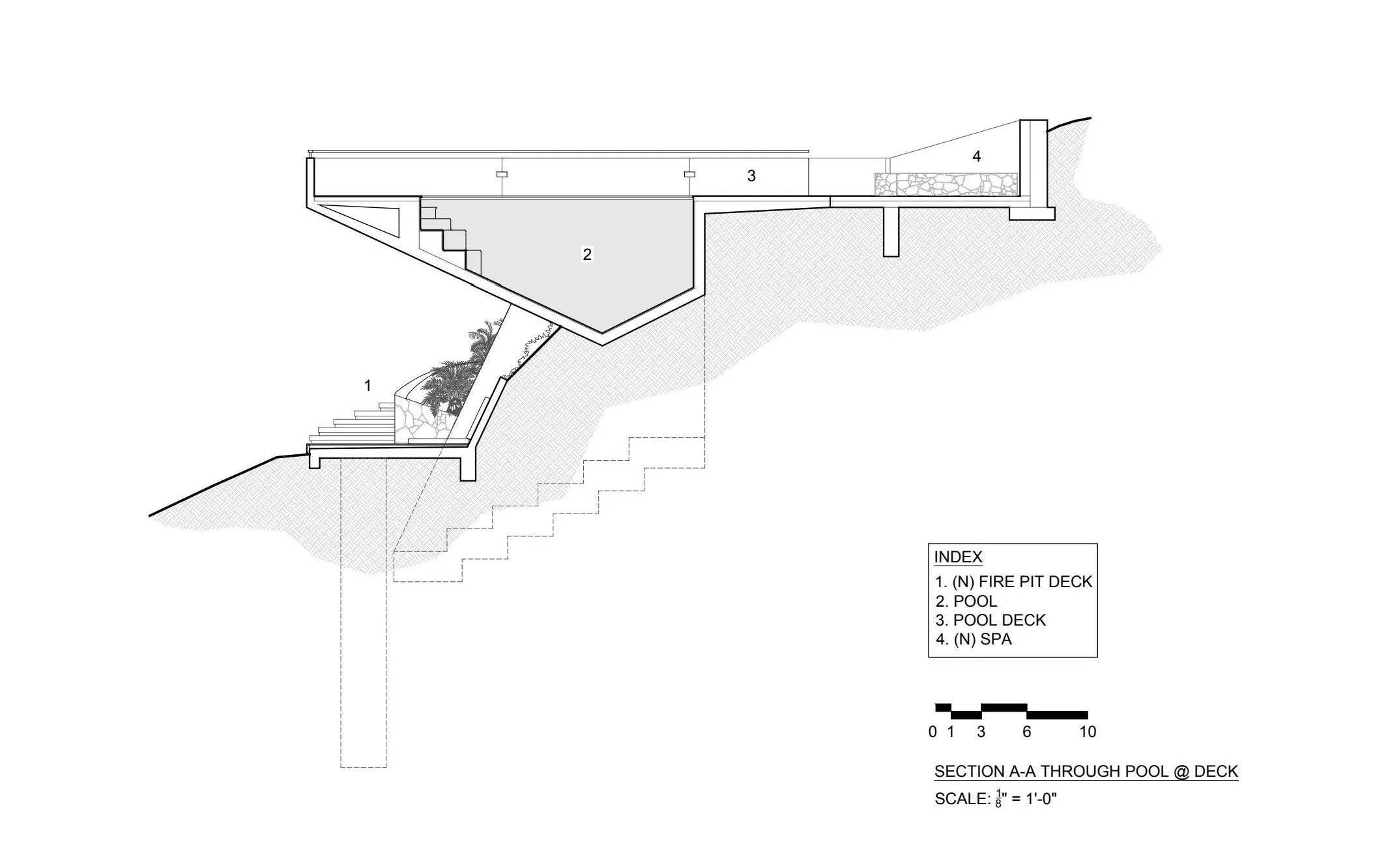 Section A-A: A technical look at the vertical stacking. By utilizing the 'undercroft' beneath the pool, we were able to create the new fire pit deck